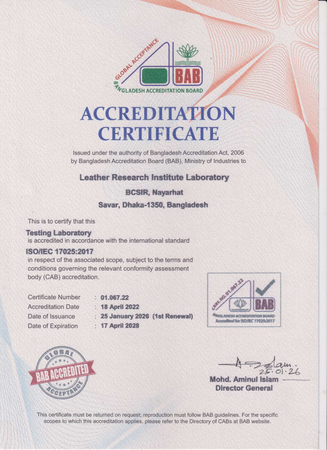 চামড়া গবেষণা ইনস্টিটিউটের অ্যাক্রিডিটেশন সনদ